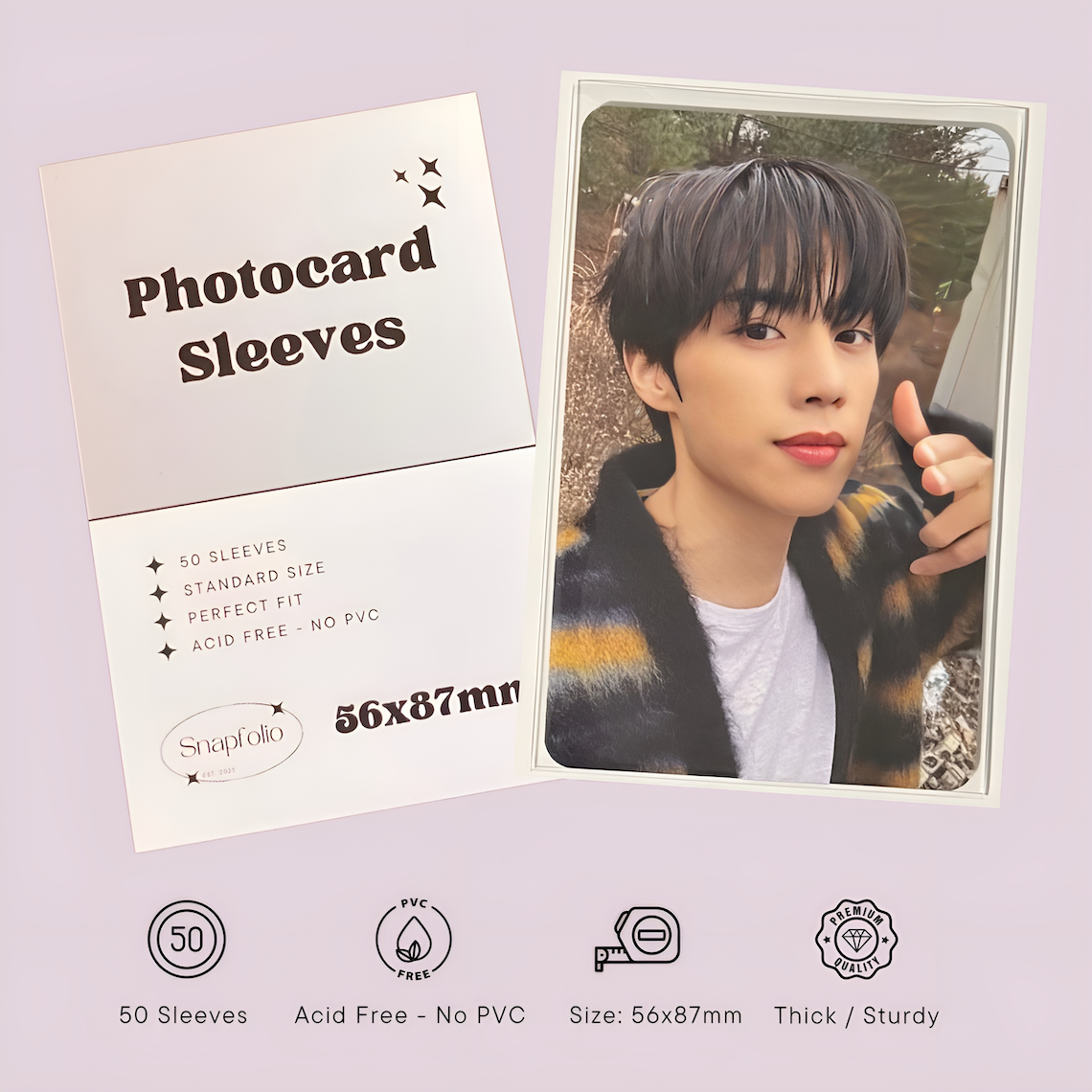 Elevate your Kpop collection with our clear, thick, and durable photocard sleeves, designed to be the perfect fit for standard official photocards. Our thick sleeves offer added protection, keeping your photocards safe and beautifully displayed in your binder.